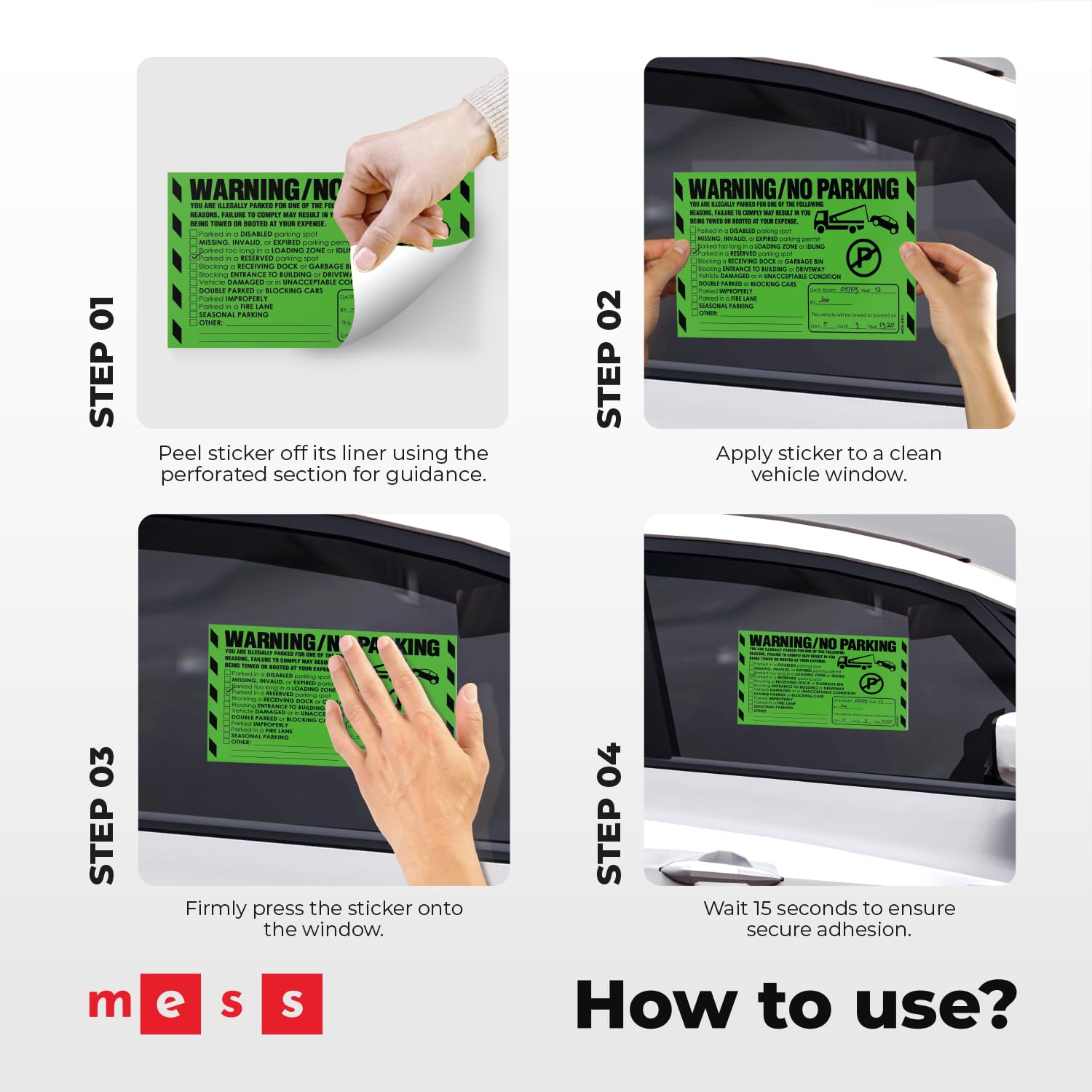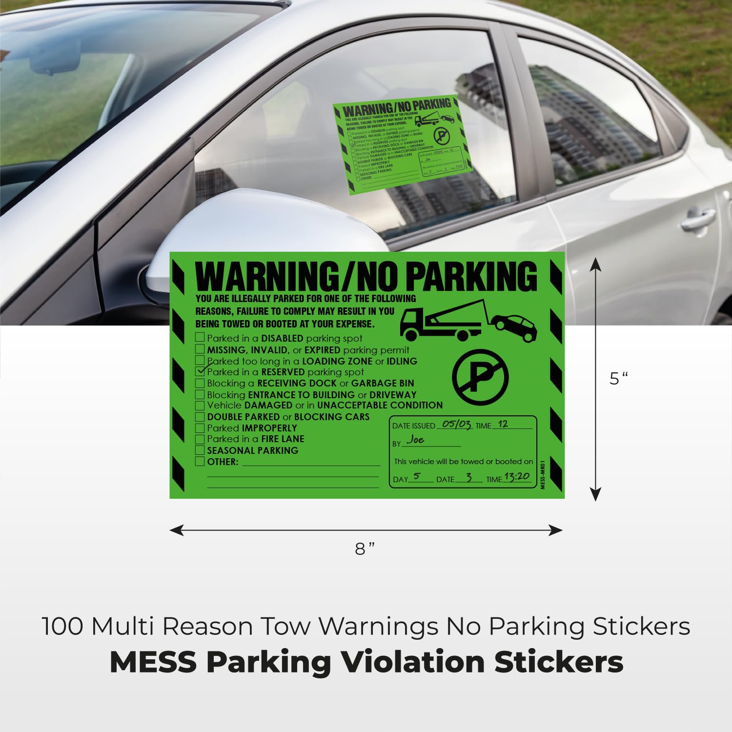 100 MESS Parking Violation Stickers - Hard to Remove - Green Multi-Reason - No Parking, Towing Warning Stickers 8x5 in 100