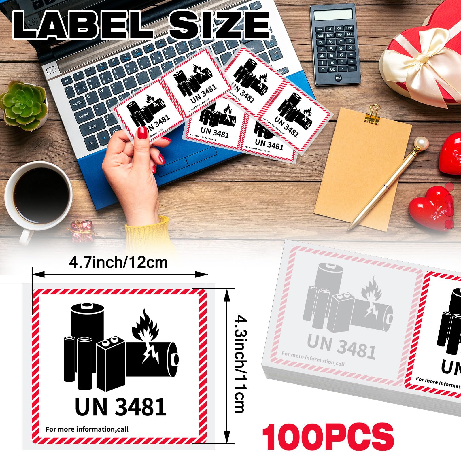 100 Pcs Lithium Ion Battery Caution Labels Un3481 Transport Caution Warning Stickers 4.7 x 4.3 Fragile Stickers for Shipping Lithium Batteries Strong Adhesive Safety 100