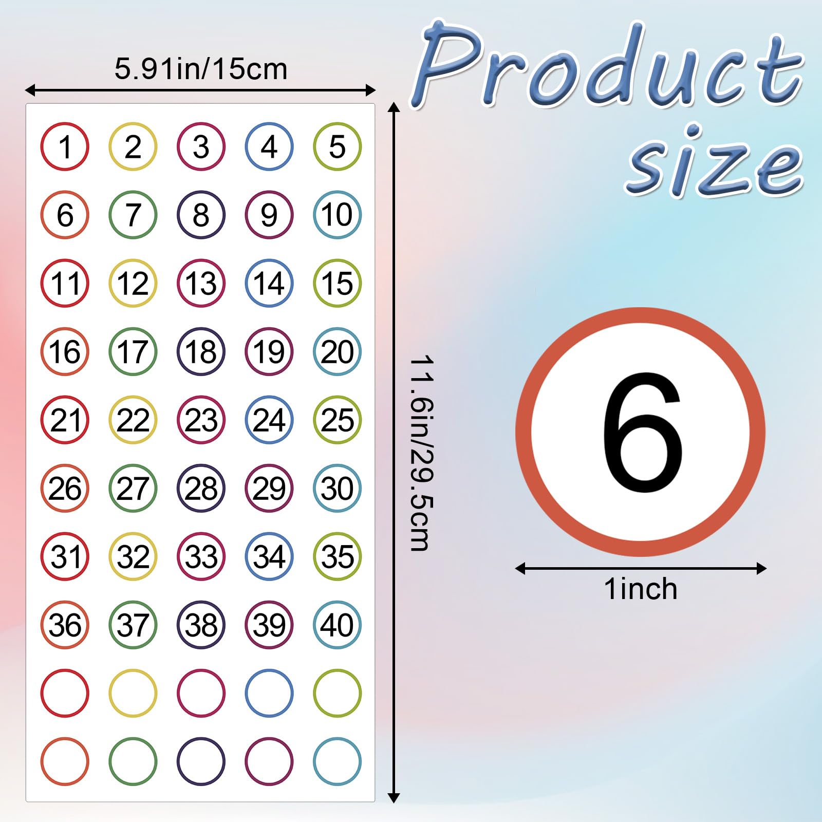 Ptwola 1000 Pcs Number Stickers 1-40 20 Sheets Dot Consecutive Number Labels Removable Self-Adhesive Colored Numbered Decals Without Residue for Office Classroom Indoor Storage Boxes Desks ChairsProduct InformationCategory: Label StickerColor: ColorfulMaterial: PaperFunction: Digital Sequence StickerProduct Size: 11.6 ×5.91 ×0.04 inches/ 29.5 × 15 × 0.1 cmPacking List: 1000pcs x Label StickerProduct Introduction1. These numbered stickers are very suitable as a teaching supply.2. These number tags can be used indoors or outdoors.3. These floor stickers for classroom can be given as a gift to your friends who like to make DIY crafts around you.