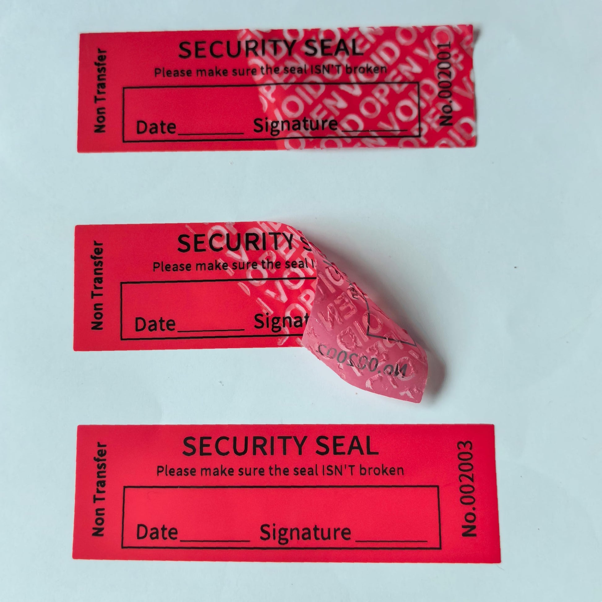 Security sticker, also called tamper-evident sticker, commonly known as the secret sticker with PET substrate. The PET negative special processing to form a matrix (matrix usually have "VOID", "OPENED", has opened a special section or customer specified ). These non-transfer security stickers provide both security and the added convenience to avoid leaving (or cleaning up) a sticky adhesive residue.These tamper evident security labels can provide a simple and cost effective solution for improving your security of assets, ideal for the reusable or expensive packages, Suitable size The size of this Tamper Evident Label is 2.5x8 cm; The small size can seal envelopes and product packaging well. Confidentiality You can fill in the signature, time, and a small part on the label. You can fill in a custom number or mark to provide maximum security. Waterproof Even if water drops on them, the material can hold it well, and is resistant to moisture, light, scratches, heat and chemicals Tamper Evident After removing the sticker, a permanent mark will be left on the surface of the protected item, which is an obvious removal trace, so as to ensure that your item is not tampered with and protect your assets. Confidentiality You can fill in the signature, time, and a small part on the label. You can fill in a custom number or mark to provide maximum security. Multi-Usage Tamper proof stickers are suitable for different products. You can stick them on the product or product packaging to increase customer trust in the product. Cosmetic product electronic product chemical product food medicine commodity office equipment etc.
