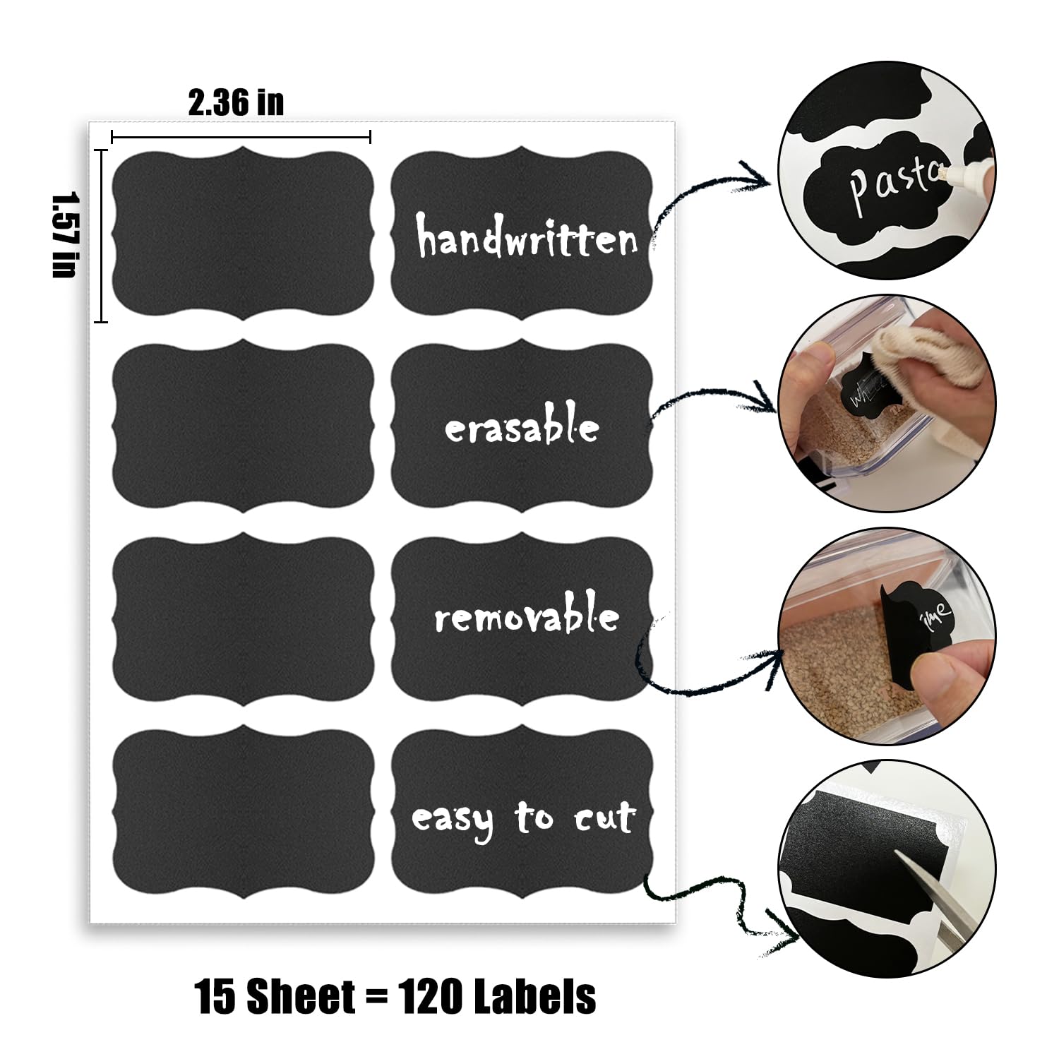 - 120 Pcs Chalkboard Labels, the writable space is 2.36 x 1.57 in, 1 Erasable Fine Tip White Chalk Marker included for easy organizing