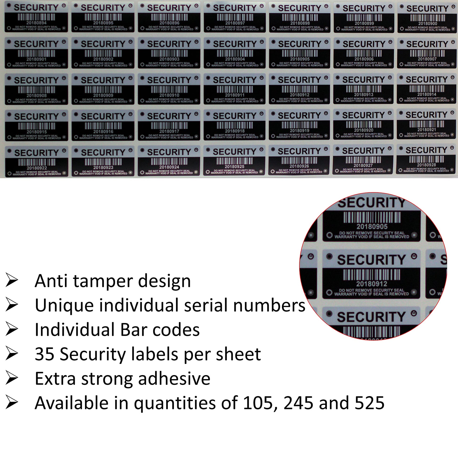 Tamper Evident Stickers, Tamper Proof Security Seal with Individual Serial Numbers and Barcode. Each Sticker is 1.56 x 0.75 inches. Destroyed Upon Removal. Residual Text Left on Item. (245 Stickers) 245 Stickers